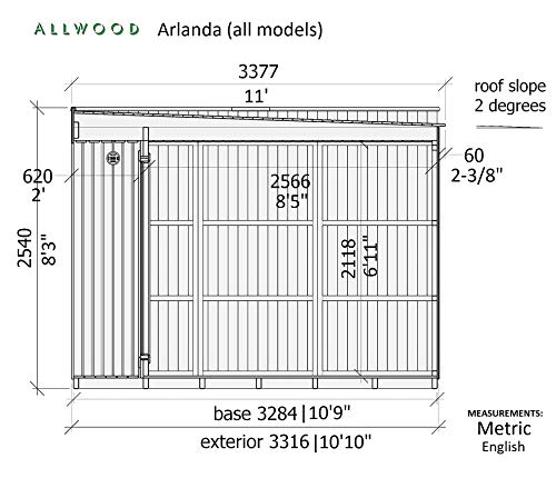 Allwood Aranda Description: Arlanda is a garden house kit made from prime quality Nordic wood. This timeless urban design is an alternative to classic log cabin styled structures. It is going to compliment almost any surroundings. Versatile Arlanda will also be set up on rooftops of multi story buildings. Assembly of this solid wood structure takes a full day for two adults. Do it yourself simple step by step directions come with the kit. Only minimal tools are needed. 3rd party installers generally charge $600 and up to assemble this model. Foundation work would be an additional cost. Arlanda Product Specifications: Wall thickness: 3/4″ * Front height of structure: 8′ 7″ * Back height of structure: 8′ 7″ * Floor boards: 3/4″ * Roof/ceiling boards: 3/4″ * Door (1): 37-3/4″ x 75-3/4″ * Windows: (4) 21-9/16″ x 67-5/8″ * Outdoor dimensions” 15′-8″ x 11′ 6″ / 180 SQF * Roof pitch 2 degrees * This Cabin Kit includes the entire parts and hardware aside from the roof shingles and foundation materials. For additional information, please see Cabin Kit FAQ. Please note: lighting shown in photo isn’t included and is a decorating suggestion only.