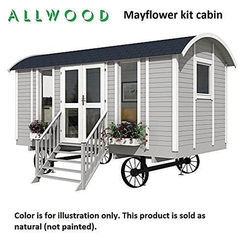 Allwood Mayflower is a modern interpretation of the wagon without the arduous journey to the West. This cozy cabin will be a Point of interest of any garden or yard. It is built from prime quality Nordic wood. Assembly of this solid wood structure takes a full day for two adults. Do it yourself simple step by step directions come with the kit and only minimal tools are needed. Mayflower Product Specifications: Wall studs: 1-3/4″ x 1-3/4″ Wall siding 3/4″ Roof arches: glue laminated 1-3/4″ x 23-5/8″ Wall height: 6′ 3″ Ridge height: 7′ 10″ with the exception of the wheels Total floor area 117 SQF Floor boards: 3/4″ Roof/ceiling boards: 3/4″ Double Door (1): 47-1/8″ x 72-7/8″ with dual pane glass Windows: (2) 23-5/8″ x 63-1/8″ – cannot be opened windows: (1) 27-5/8″ x 67″ – will also be opened window that may be placed at either end of cabin. This Cabin Kit includes all of the wood parts and hardware excluding the roof shingles.