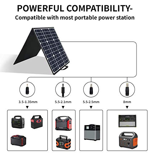 POWERFUL COMPATIBILITY – DC 18V 50W OUTPUT, Compatible with most solar generator on the market.Includes different size of connectors (5.5*2.1mm, 5.5*2.5mm, 3.5*1.35mm, 8mm) for your Suaoki/Jackery Explorer 240 / Webetop/Goal Zero Yeti/Paxcess Portable Power Station. Total 5V 2.1A 、USB output Power your electronic devices such as smartphones and tablets.